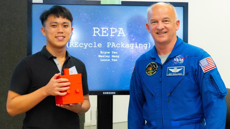 Four teams unlock innovative solutions in space with 3D printing technologies The winning team’s (Team REPA) representative Louis Tan with NASA Astronaut Jeffrey N. Williams. (SIT ...